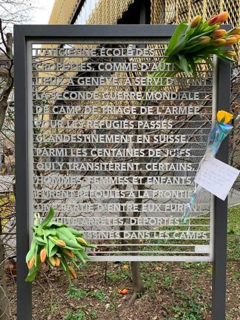 "Pour lutter contre l'oubli, une plaque commémorative a été édifiée par la Ville de Genève au Parc des Cropettes le 27 janvier 2016. Elle rappelle que l'ancienne école maternelle qui s'élevait ici avait été transformée, pendant la Seconde guerre mondiale, en camp de triage pour les réfugiés qui cherchaient asile en Suisse, réfugiés juifs notamment, condamnés à la déportation et à la mort parce que Juifs.